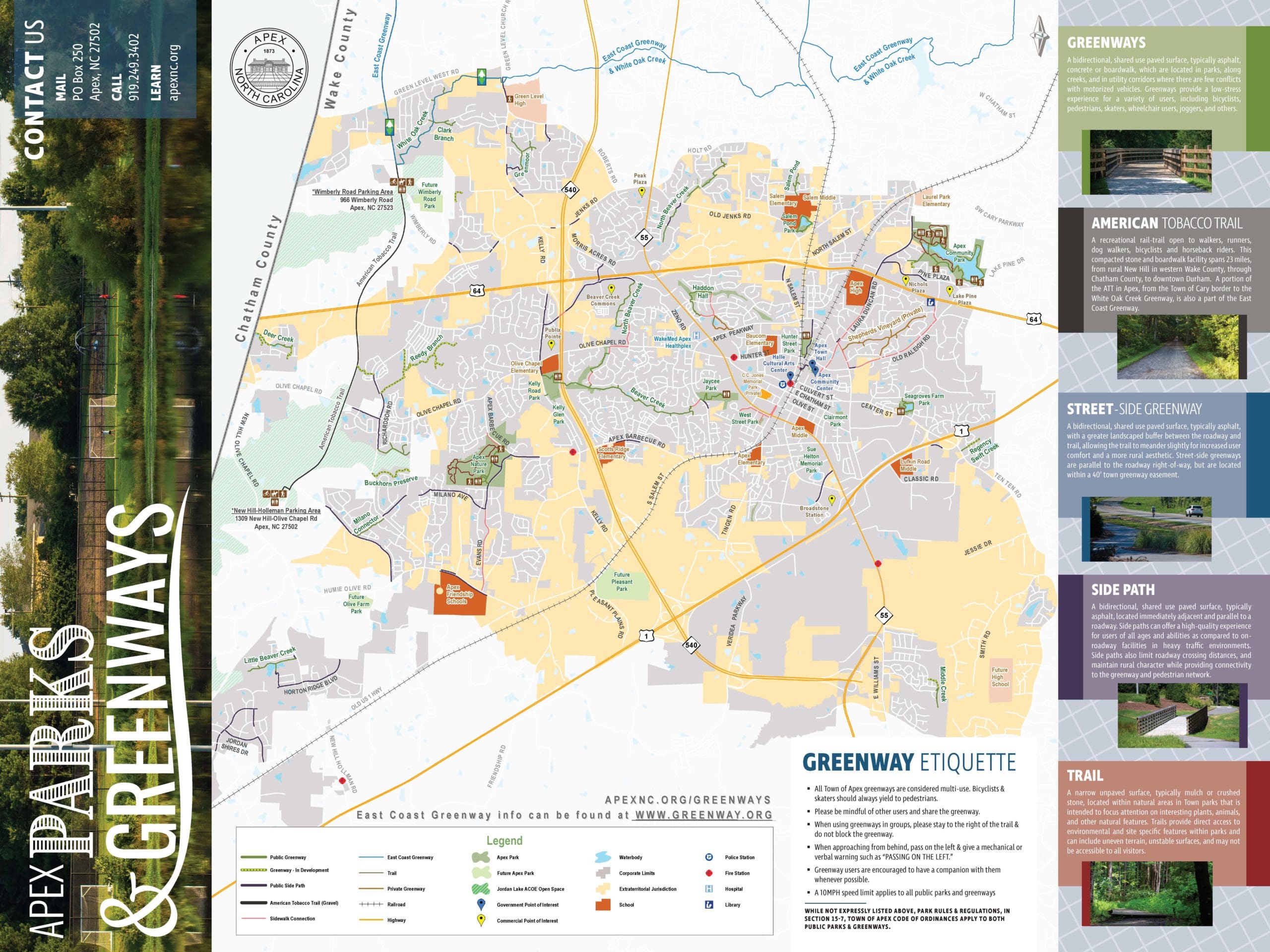 The Town hired WithersRavenel’s Marketing Team to design an eight-fold pamphlet that included a detailed, GIS-integrated map of all municipal greenways and trails, including landmarks and parks. The pamphlet included a glossary of common parks and recreation terms as well as visitor information and municipal photos. This tangible product serves as an important and personal keepsake. It is an easy resource that the public can use to locate unique spots within the Town instead of relying on often-confusing GPS phone applications.